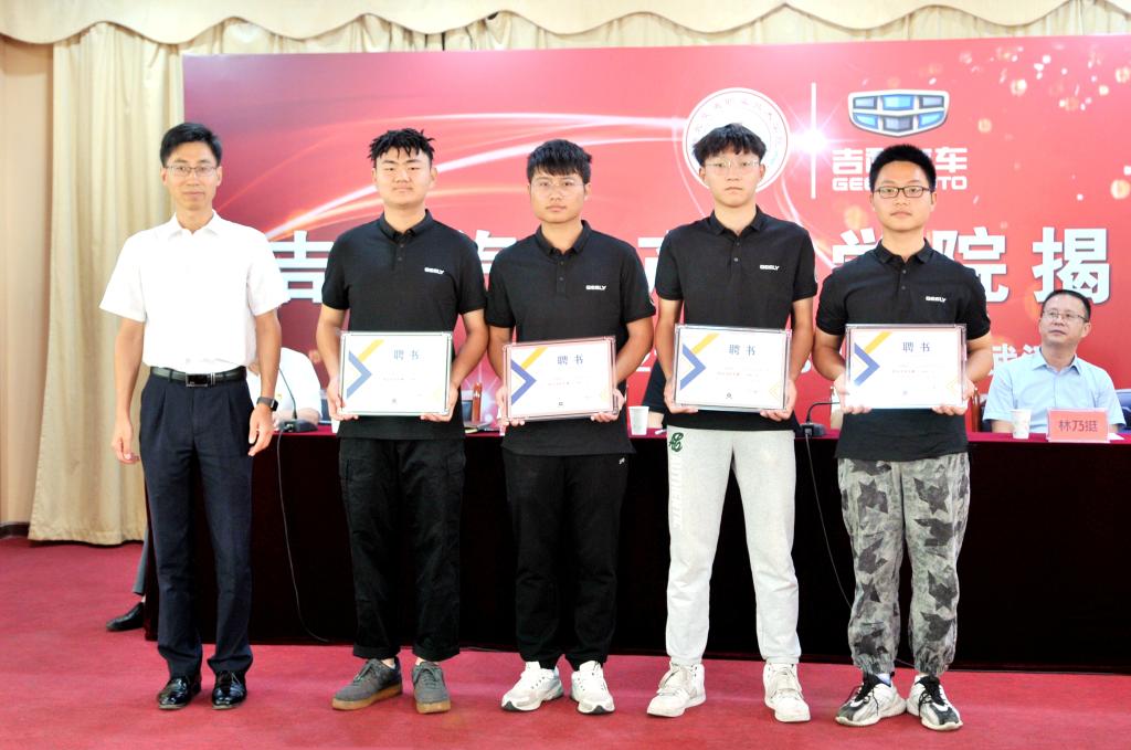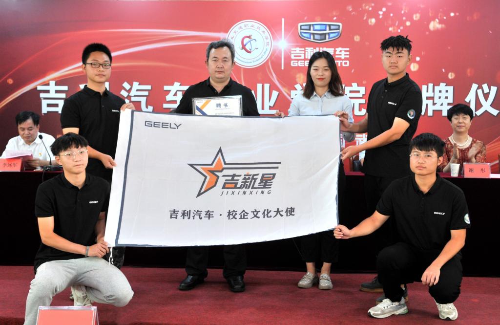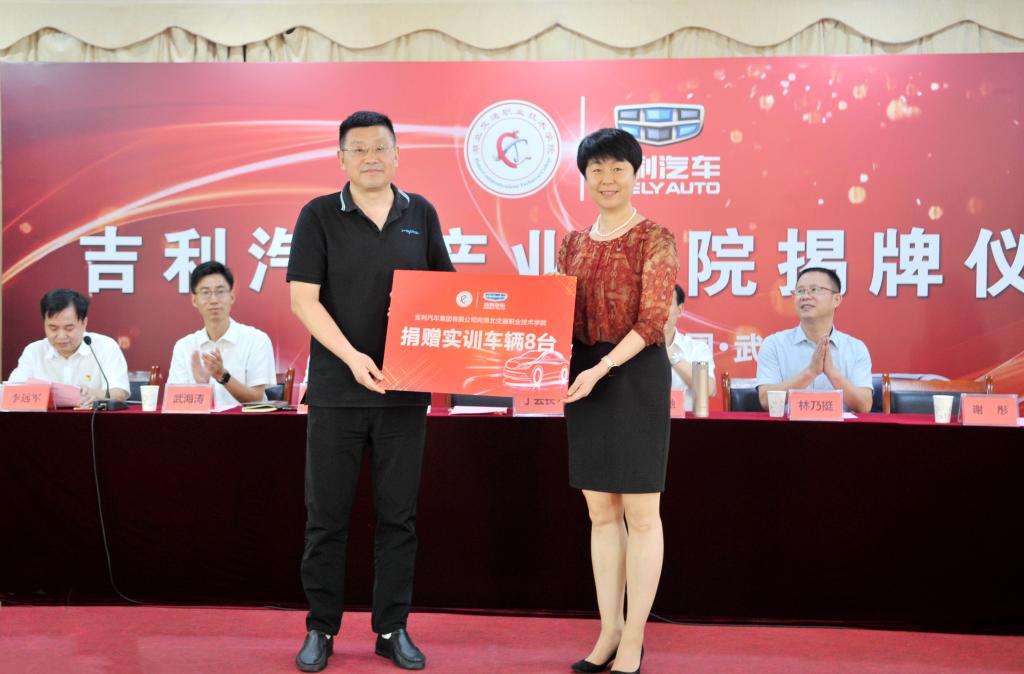 仪式上,李全和林乃挺代表校企双方为吉利汽车产业学院揭牌,吉利汽车集团向我校捐赠了8台实训教学车辆,现场为吉利汽车文化大使颁发了聘书和会旗。