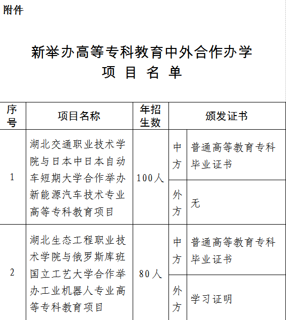 2021年12月10日,湖北省教育厅公示了2021年下半年高等专科教育中外合作办学项目评审结果,我校与日本中日本自动车短期大学合作举办新能源汽车技术专业群高等专科教育项目名列其中,成功获批。