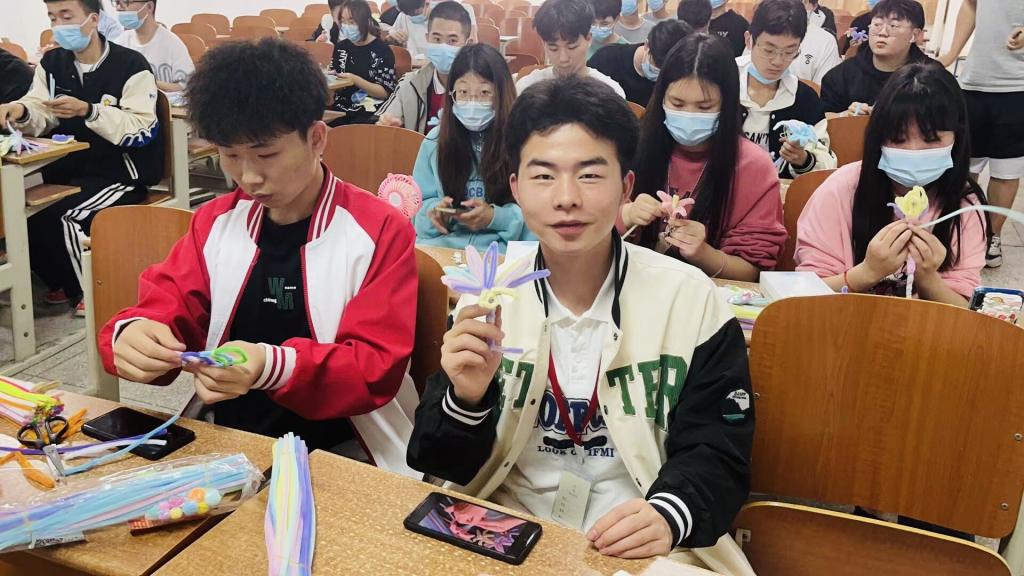 在胡梦迪老师的讲解和演示下,大家选取自己喜爱颜色的扭扭棒,充分发挥想象力和动手能力,不断制作出一个个或精美或憨态可掬的作品。活动过程中同学们积极交流、现场气氛热烈。