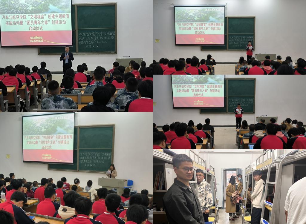 孔盼盼、胡梦迪分别在两校区宣读了《汽车与航空学院“文明寝室”创建主题教育实践活动暨“团员青年之家”创建活动实施方案》,对全院“文明寝室”创建系列活动做出安排。学生代表陈信和团员代表周乐彦、陶刚分别发言,他们表示将会以身作则,以此次活动为契机,带动全院团员青年踊跃参与,培养良好的生活习惯和文明风貌,并将“文明寝室”“团员青年之家”创建各项标准要求内化于心、外化于行,用创建活动产生的成果惠及自身学习生活,收获进步与成长!