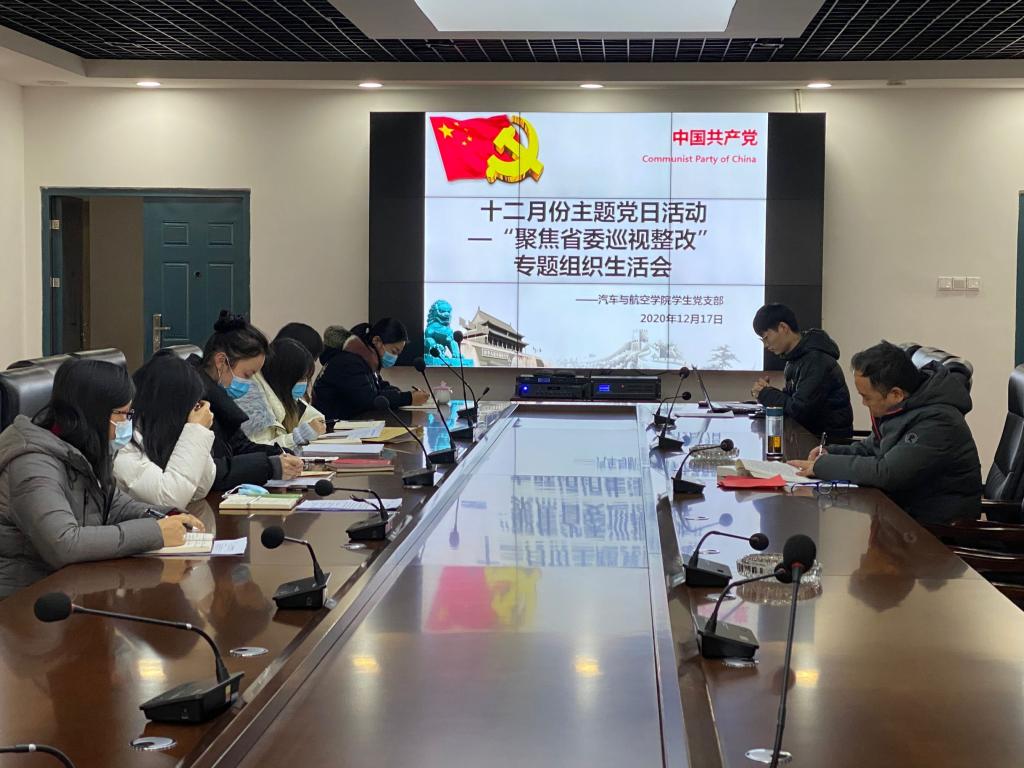 12月17日下午,汽车与航空学院学生党支部在协同创新中心组织开展12月份主题党日活动--“聚焦省委巡视整改”专题组织生活会。本次会议通过线上、线下相结合的方式,使党支部全体教工、学生党员参与其中,活动由胡毓主持。