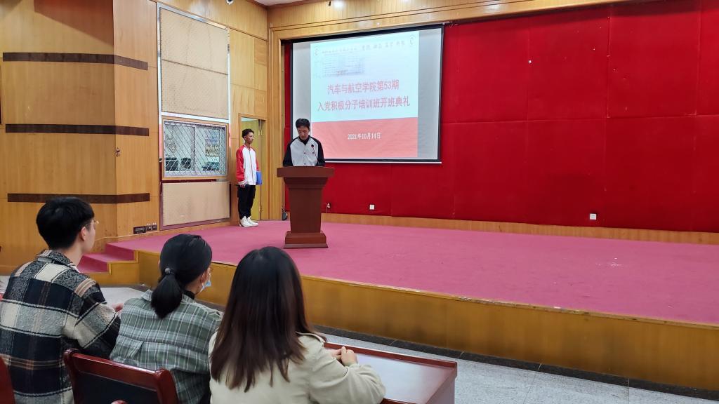 10月14日,汽车与航空学院第53期入党积极分子培训班在五楼学术报告厅正式开班,汽车与航空学院学生党支部全体党员教师、新能源汽车技术专业群教师党支部常同珍同志以及80名入党积极分子参加活动。