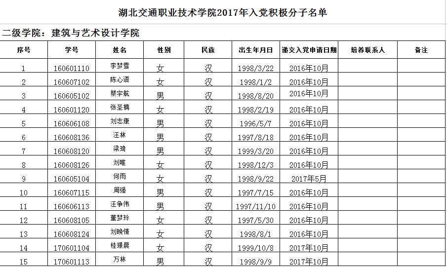 建筑与艺术设计学院16、17级学生15名经过基层团支部推荐,政治上积极要求进步,各方面表现良好,已基本具备推优条件,经过学院党总支、辅导员和老师审核,一致通过。