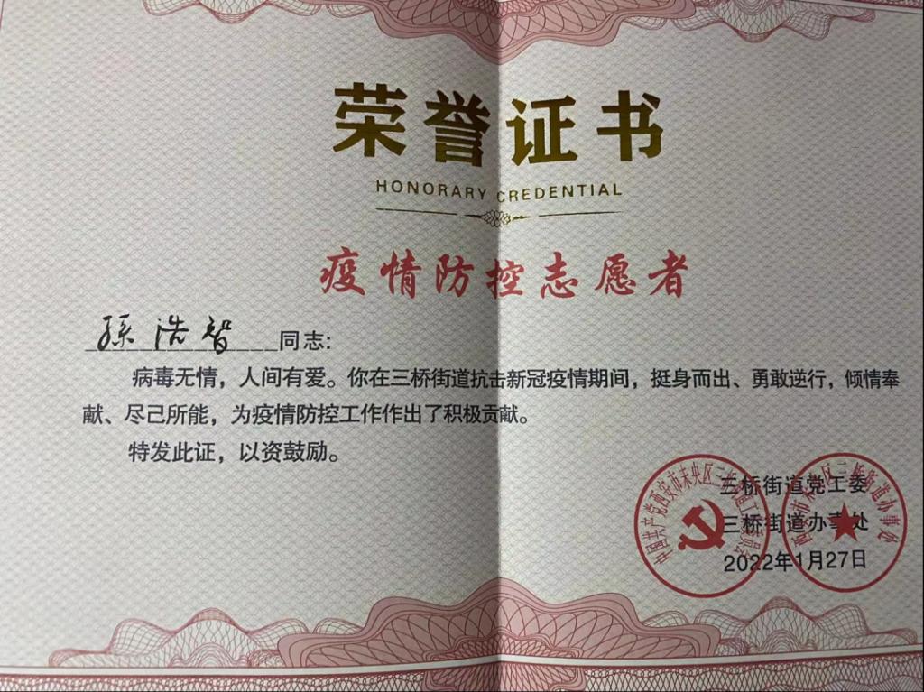 在疫情又一次反弹时,孙浩智同学坚守着小区住户的安全。她深刻体会到社会实践的真正意义,在志愿服务当中还认识到社会交往情绪的重要性。孙浩智同学表示此次志愿服务收获颇丰,在今后好好学习,不断精进,刻苦钻研,在未来可能面临的困难中,打出漂亮的一仗。