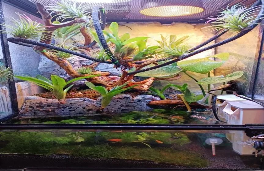 此作品是一个雨林生态缸,其中利用到的废品多样化,主体构架是树根和泡沫板做成的,背景用的是软泡沫塑料,树藤是用轮胎切碎后放上面的,水底和陆地上的苔藓是用铁网和积水凤梨,里面还有动物,营造出生机勃勃的氛围。
