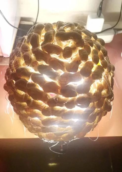 采用了我们过年都会吃的花生,利用气球,把花生壳固定成为一个椭圆形,再把气球取出,这样一个蜂窝形状的小夜灯就完成了,想法十分新颖。大家也可以尝试一下。