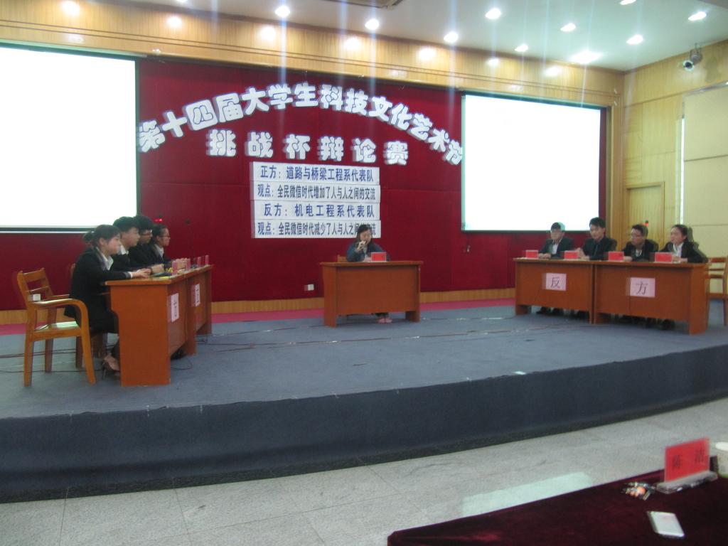 4月16日同样在学术报告厅,击败了道路与桥梁工程系成功进入决赛。比赛当天我系辩手旁征博引,论辩了全民微信减少了人与人交流。在开篇立论立论的环节中,我系一辩通过当下微信摇一摇,摇红包等社会热题证明微信减少了人与人交流。随后在盘问与攻辩的环节中我系辩手提出微信的使用量仅仅是量变不是质变的观点,同时利用女生不喜欢男生用微信来表白的现象巧妙的回应了对方辩手微信下载量增加的问题。最后在总结陈词期间我系四辩落地声音,强有力的说明全民微信减少了人与人之间的交流。在辩论赛期间观众提问也是精彩不断,观众们以“现在谁没有玩微信”的难题将现场气氛推向高潮。最后由张洁同学总结,她充分肯定了此次比赛的精彩并指出双方辩手的优缺点。在长半小时的辩论中,我系最终拿下此次比赛成功进入决赛。
