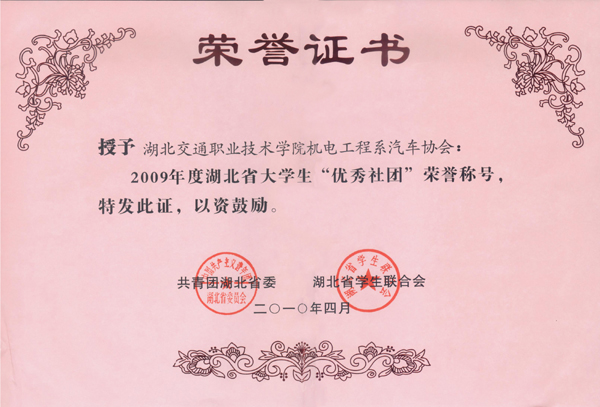 近日,从共青团湖北省委传来喜讯,我院机电工程系汽车协会和陈鹏个人分别荣获“2009年度湖北省大学生“优秀社团”、“优秀社团干部”称号。