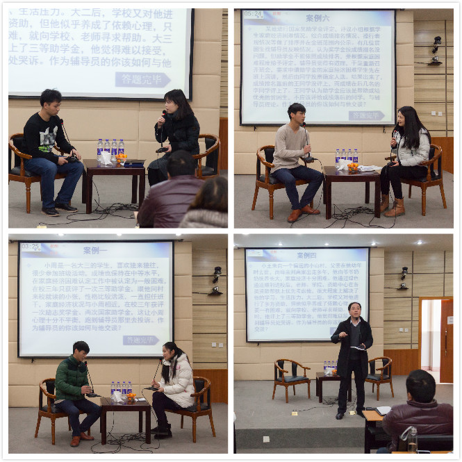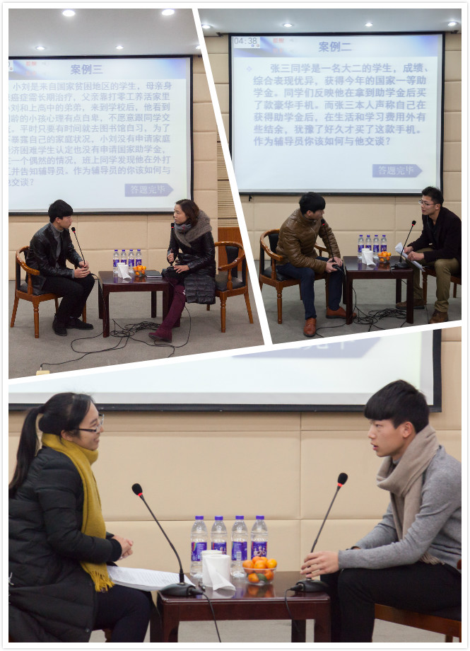 交流会上,思想政治教育处负责人就习近平总书记在全国高校思想政治工作会议上的重要讲话精神进行宣贯解读;6个二级学院的辅导员代表就资助工作中实际发生的案例与学生演员进行谈心谈话表演;心理健康教育中心负责老师对谈心谈话环节进行了专业的点评;学生资助办公室负责人对2016年度资助工作进行了总结,并就资助工作常见问题和工作难点做了解析说明。