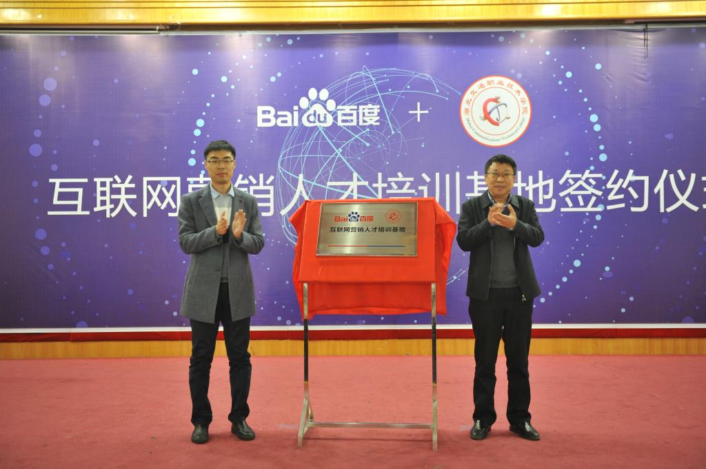 1月10日,百度(中国)有限公司百度直销共享招聘中心HR Head李玉滨一行到访我校,与我校副校长王孝斌共同签署“互联网营销人才培训基地”校企合作协议。党委书记戴光驰出席签约仪式,校长陈方晔为“互联网营销人才培训基地”揭牌。学校相关部门负责人和交通信息学院师生参加仪式。