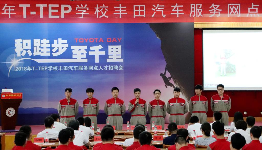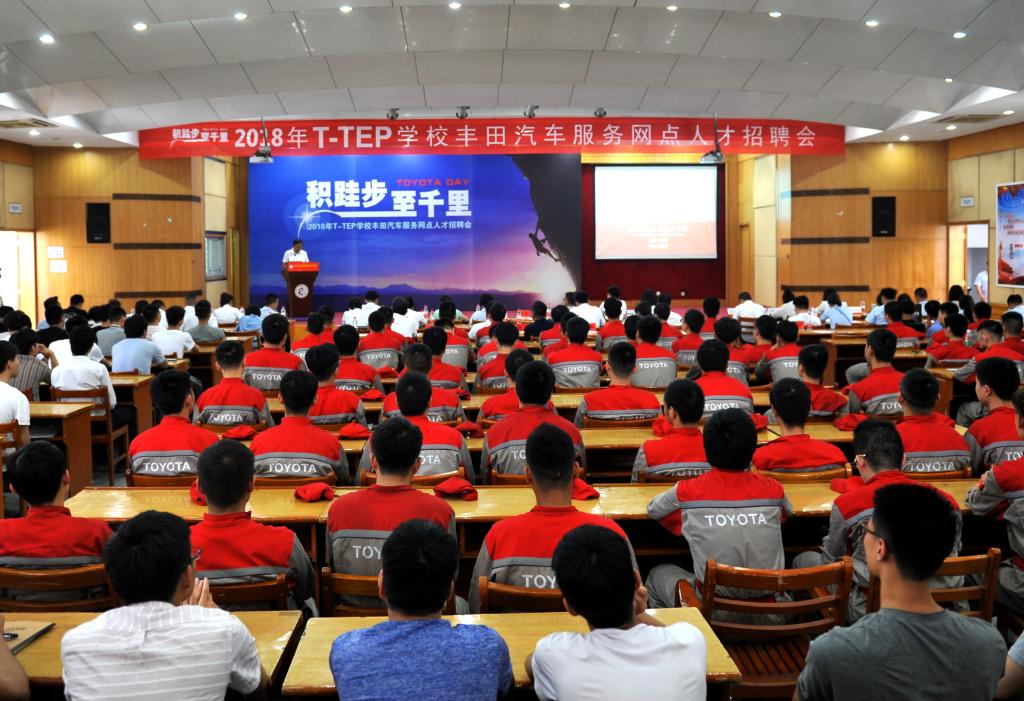 6月7日,“积跬步 至千里”2018年 T-TEP丰田汽车公司服务网点人才招聘会(TOYOTA-DAY)在学校隆重举行,来自全省的一汽丰田、广汽丰田、雷克萨斯16家丰田经销店参会,提供了包括一般维修、钣金、喷漆、服务顾问、销售在内的170个职位,我校120多名学生与企业当场签下就业意向协议。