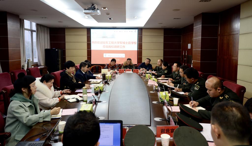 12月26日下午,陆军工程大学军械士官学校教务处处长邵喜春上校、基础部副主任归玉晓中校等一行九人来我校进行调研与合作洽谈,副校长谢彤、王孝斌及相关职能处室、二级学院负责人参加了洽谈会。会议由副校长谢彤主持。 邵喜春上校从2019年重点专业建设、公共基础教学、比武竞赛、教学改革研究以及军民融合人才培养模式探索这五个方面谈了未来可能的合作方向,希望双方能够共同探索军民融合新模式,为国家和部队输送高素质军事人才。 王孝斌副校长介绍我校目前士官生培养的基本情况以及未来的规划打算,表示学校将加大软硬件的投入,稳定并适度扩大定向士官培养的规模和专业覆盖面,进一步提升人才培养质量,为部队输送更多有灵魂、有本事、有血性、有品德的高素质士官人才。并期望能与贵校更进一步地深入合作,为学生成长、国防建设、军民融合国家战略做出更多贡献。 会上,双方就定向士官人才的培养方式进行了充分的探讨,双方均希望能够利用地理优势,整合地方院校的职业技能培养优势和部队的专业素质培养优势,共同制定人才培养方案,联合培养士官人才。 会后,邵喜春上校一行在校领导的陪同下先后参观了汽车与航空学院宝马、丰田实训基地,交通信息学院的中兴通讯智能交通学院以及物流与交通管理学院文化长廊和党员活动室。(摄影/贺婷婷)