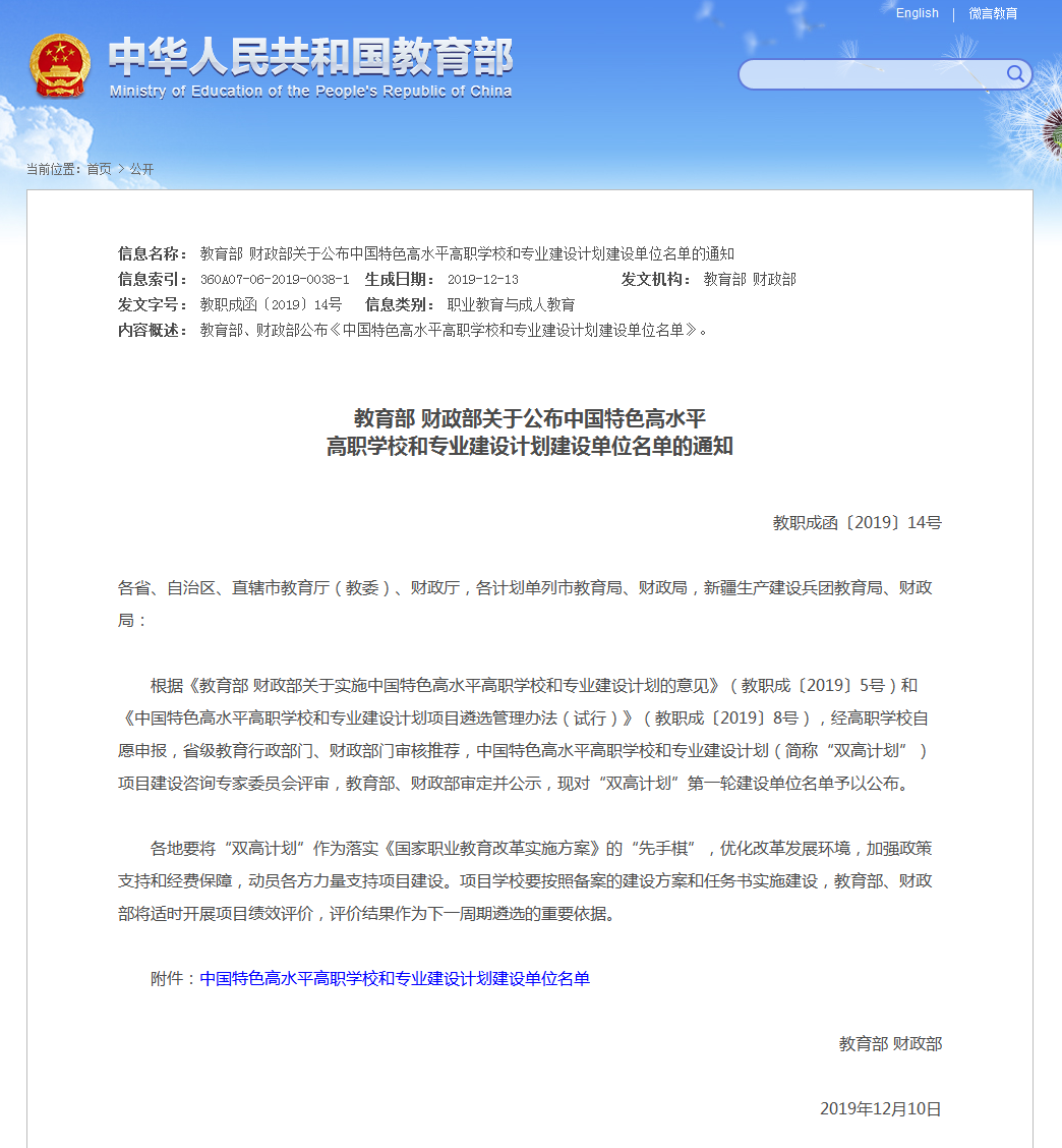 12月10日,教育部、财政部发布了《教育部财政部关于公布中国特色高水平高职学校和专业建设计划建设单位名单的通知》,公布了“中国特色高水平高职学校和专业建设计划”(简称“双高计划”)第一轮建设单位名单,我校凭借新能源汽车技术专业群成功入选为“高水平专业群建设单位”,湖北省仅有8所高职院校入选“双高计划”建设单位。 据悉,“双高计划”建设单位评选根据《教育部 财政部关于实施中国特色高水平高职学校和专业建设计划的意见》(教职成〔2019〕5号)和《中国特色高水平高职学校和专业建设计划项目遴选管理办法(试行)》(教职成〔2019〕8号),经高职学校自愿申报,省级教育行政部门、财政部门审核推荐,“双高计划”项目建设咨询专家委员会评审,教育部、财政部审定并公示。 学校入选“双高计划”建设单位,是学校继获批全国优质高职院校之后的又一重要历史发展机遇,是学校实现高质量高水平发展的强大动力,在新时代、新起点、新征程上,学校将以此为契机,不忘初心、牢记使命,聚焦交通、瞄准市场,深化改革、狠抓落实,努力把学校建设成行业领先、全国一流、世界水平的现代化高水平职业院校。