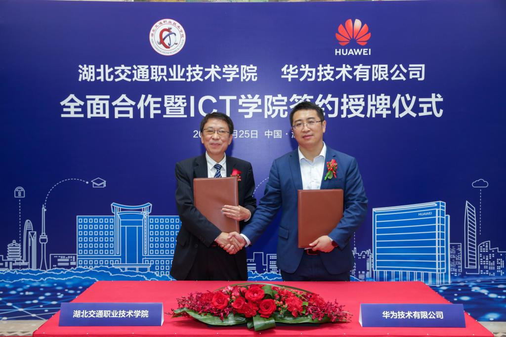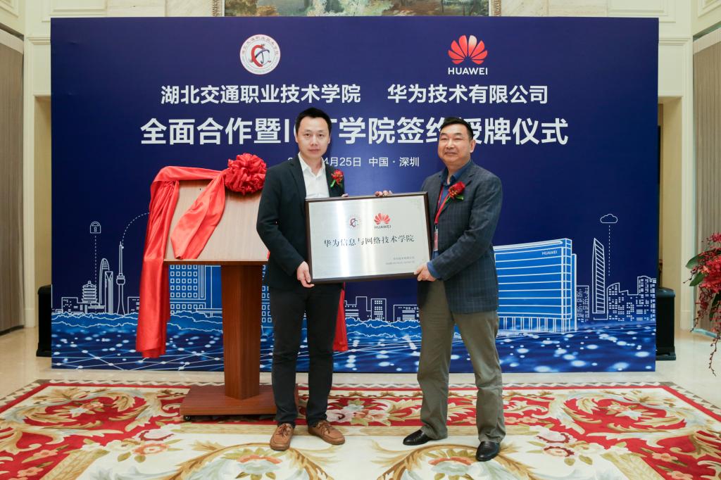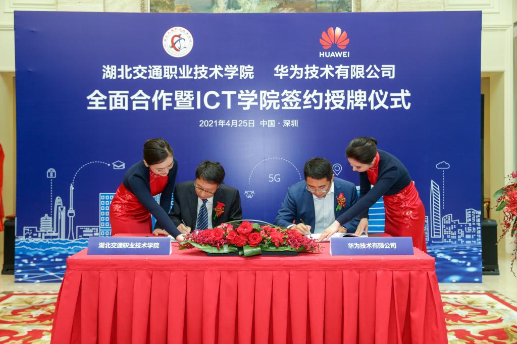 4月25日,我校与华为技术有限公司签署全面合作协议,并举行ICT学院授牌。学校校长陈方晔、副校长王孝斌,华为湖北省政务业务部部长孙承奎、华为中国政企教育业务部副部长张海鹏、华为湖北省政务业务部武汉市总经理刘旭帆出席签约仪式。