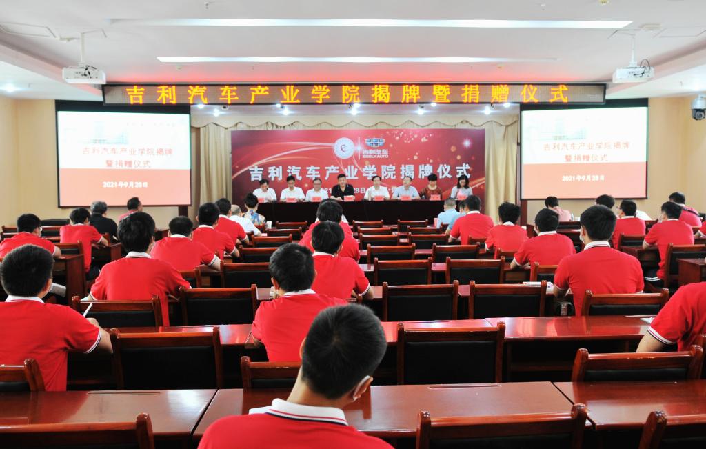 9月28日,吉利汽车产业学院揭牌暨捐赠仪式在我校培训楼三楼多功能厅隆重举行,标志吉利汽车产业学院在我校正式成立。吉利汽车集团有限公司杭州湾公司副总经理丁云长、吉利轩宇宁波分公司总经理兼技能管理部部长林乃挺等企业嘉宾,校领导戴光驰、李全、谢彤出席仪式,相关职能处室负责人和汽航学院师生代表参会。