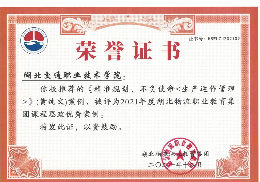 会上,我校物流与交通管理学院推荐的《精准规划,不负使命<生产运作管理>》案例被评为2021年度湖北物流职业教育集团课程思政优秀案例,并被遴选至教育部首批国家级教育教师教学创新团队课题《物流管理专业“课程思政”的载体与方法创新研究》,将向全国出版发行。