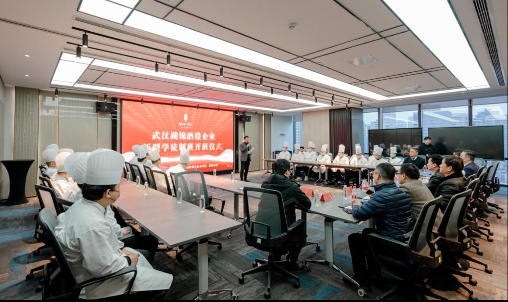 2月22日上午,由武汉船院和武汉湖锦酒楼管理有限公司共同举办的“新型学徒制班”开班仪式在湖锦酒楼三阳路店正式举行。院长魏少峰、副院长肖亚明、职培中心主任王磊、经管学院院长朱春浩、江岸区人社局局长汪贝漓、湖锦酒楼管理公司总经理李谦、企业学徒制部分学员参与开班仪式。