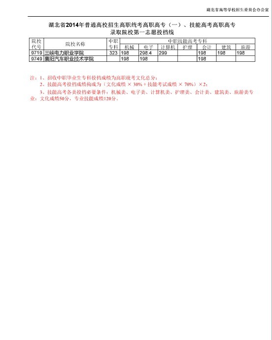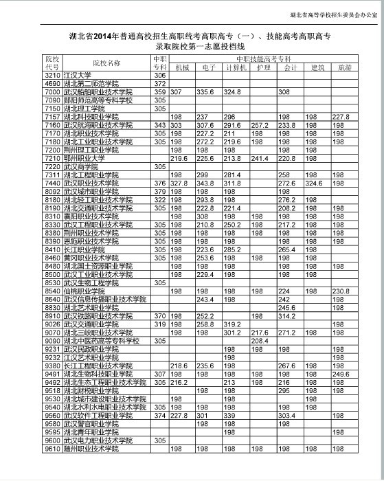湖北省2014年普通高校招生高职统考高职高专(一)、技能高考高职高专录取院校第一志愿投档线