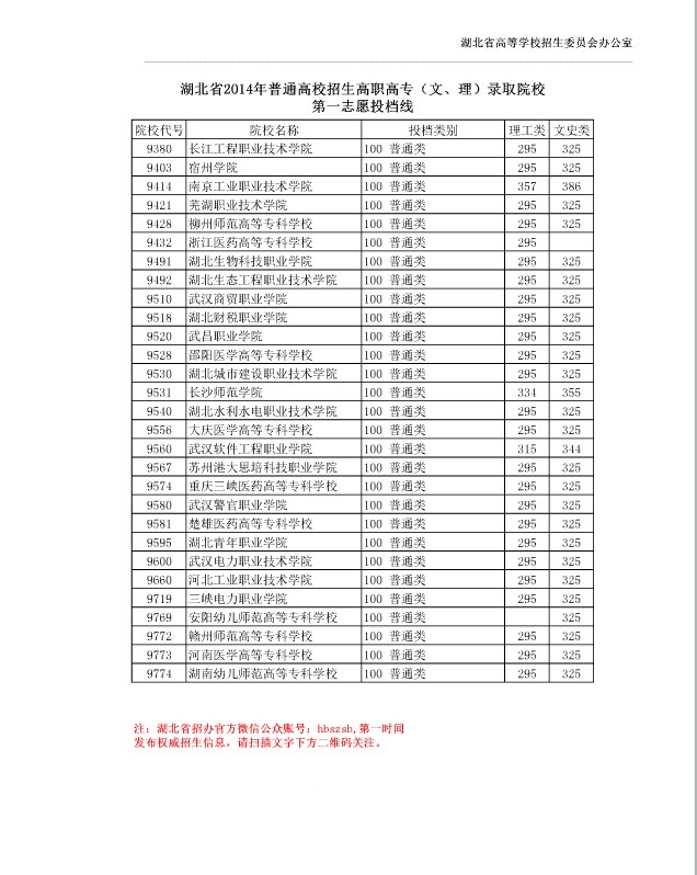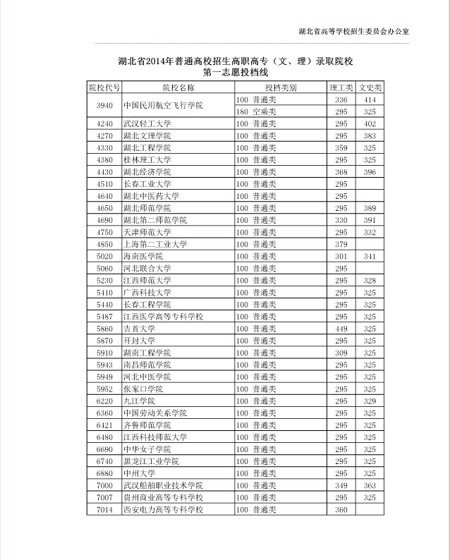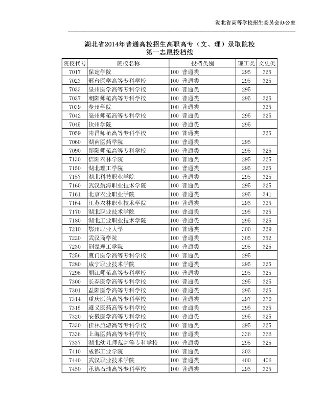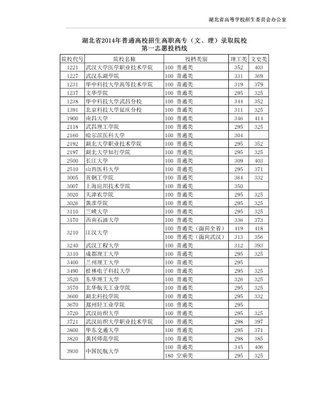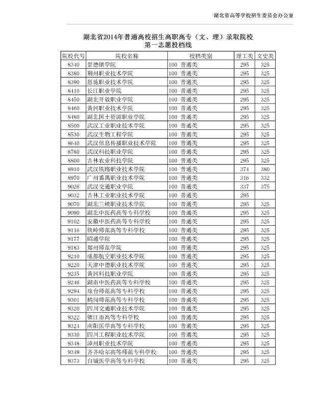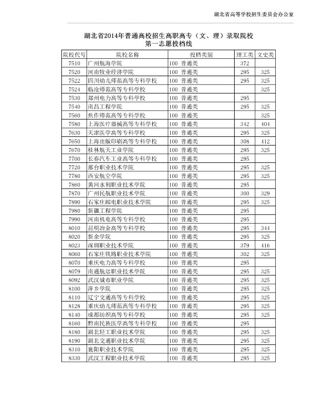 湖北省2014年普通高校招生高职高专(文、理)录取院校第一志愿投档线