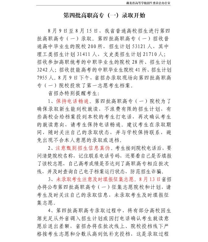 第四批高职高专(一)录取开始