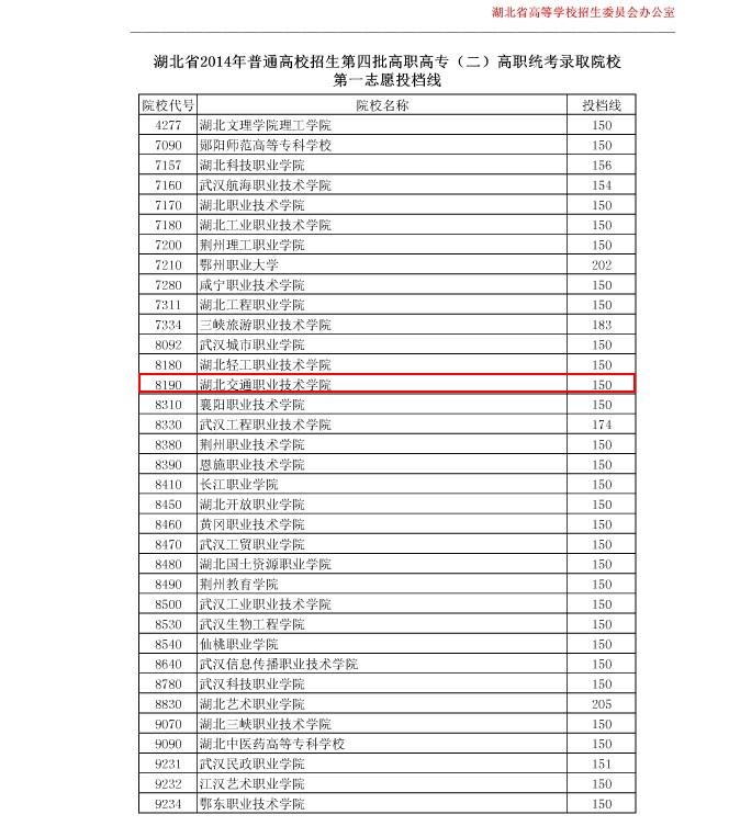 湖北省2014年普通高校招生第四批高职高专(二)高职统考录取院校第一志愿投档线