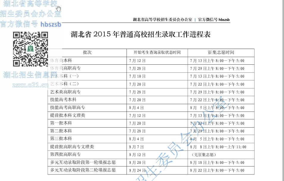 湖北省2015年普通高校招生录取工作进程表