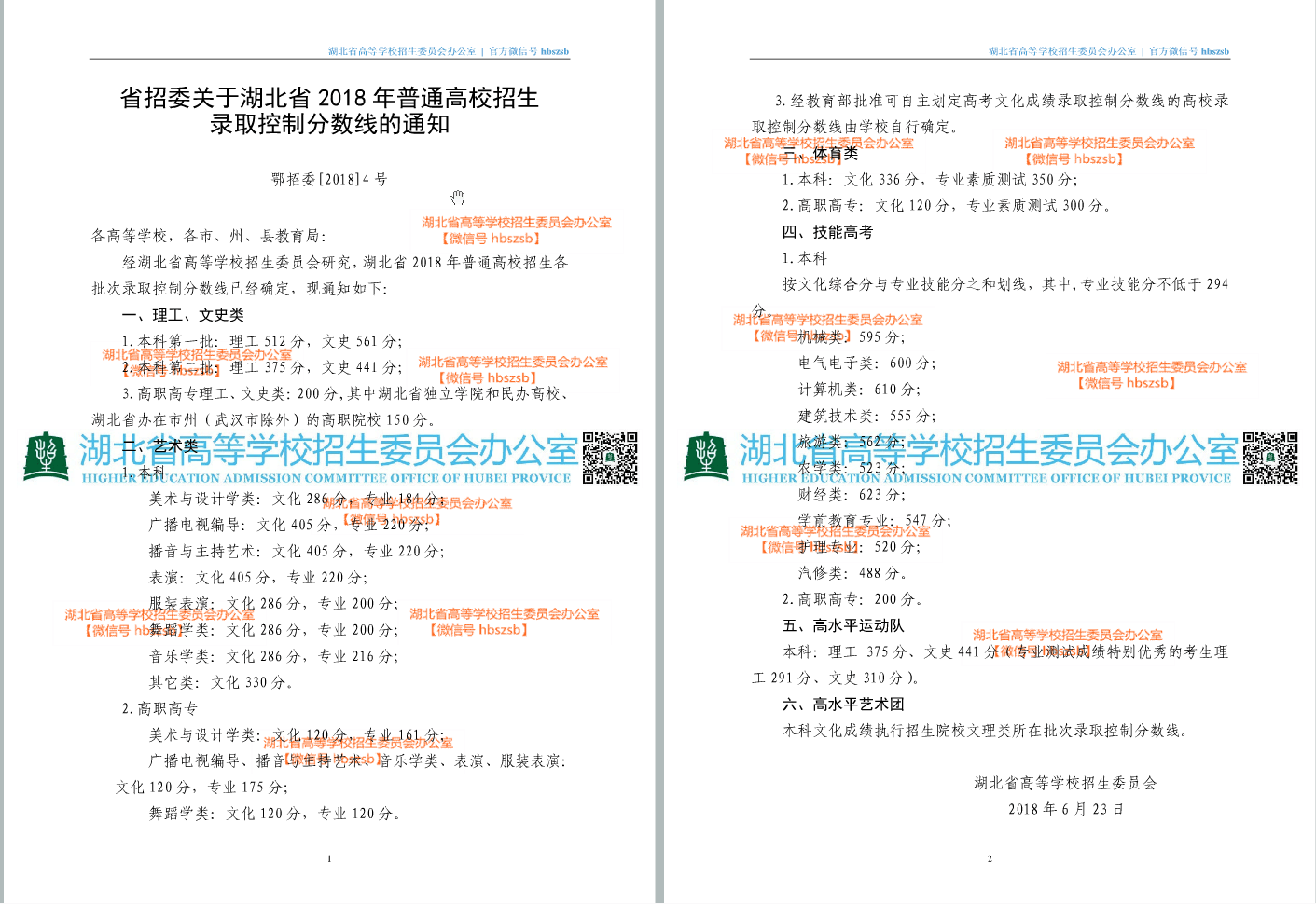 省招委关于湖北省2018年普通高校招生录取控制分数线的通知