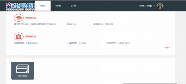 (二)登录系统后,显示个人信息,下方是报到流程财务缴费环节,点击财务缴费